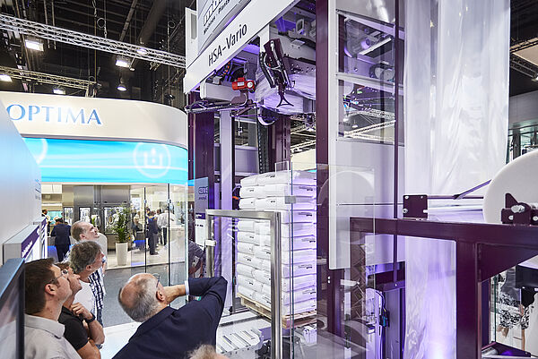 Im Fokus stand die konkrete Anwendung – und damit die Live-Performance des Haubenstretcher HSA-Vario mit Doppelkopf und der zum Patent angemeldeten Folienenden-Auswurfvorrichtung. Das Wechseln der Folienrolle und die Entnahme des Folienendes erfolgen außerhalb des Gefahrenbereichs der Maschine und vereinfachen Wartungsarbeiten – Stillstandzeiten entfallen.