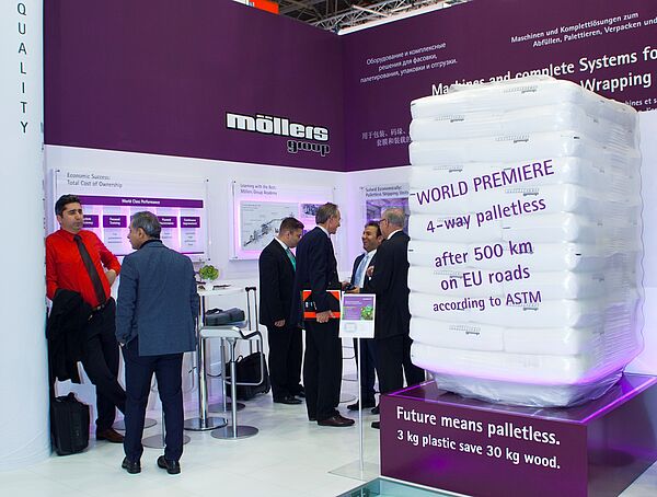 Mit der Weltpremiere des palettenlosen 4-Wege-Paketes auf dem purple Catwalk manifestierte die Möllers Packaging Technology auf der Düsseldorfer Kunststoffmesse K ihre Marktführerschaft. Volle Auftragsbücher bis tief in das zweite Halbjahr 2017 und hohes Interesse an den Schulungsangeboten der Möllers Packaging Technology Academy bilanziert Vertriebsleiter Norbert Frenzel den Messeerfolg. Mehr noch: Die zukunftsweisende Idee, den ganzheitlichen Ansatz von „Total Cost of Ownership“ in greifbaren Produkten zu bündeln, überzeugte das internationale Fachpublikum.